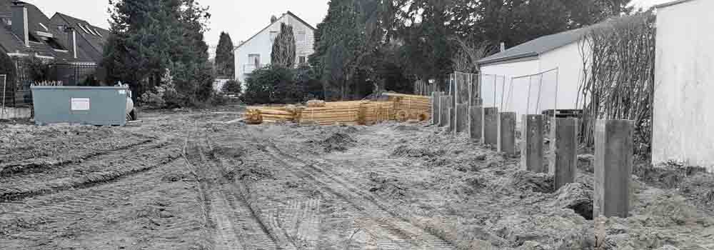 Auf dem Grundstück in Ratingen wurde kürzlich von einem Spezialtiefbau Unternehmen (Fritzsche Tiefbau aus Neuss) mit der Herstellung einer Trägerbohlwand zur Sicherung der Baugrube begonnen. Dafür wurden zunächst vertikale Stahlprofile (meist H-Träger) in regelmäßigen Abständen in den Boden eingebracht. Diese Träger bilden das tragende Gerüst der späteren Baugrubenwand. Der weitere Ausbau erfolgt nun schrittweise beim Auskoffern der Baugrube. Dabei wird der Boden nicht sofort vollständig ausgehoben, sondern lageweise in einzelnen Abschnitten entfernt. Nach jedem Aushubschritt werden horizontale Bohlen – häufig aus Holz – zwischen die Stahlprofile eingeschoben. So entsteht nach und nach eine geschlossene Wand, die das seitliche Nachrutschen des Erdreichs verhindert und die Baugrube stabilisiert. Für Außenstehende wirkt diese Bauweise in der Anfangsphase oft etwas ungewöhnlich: Zunächst sind nur die einzelnen Stahlträger sichtbar, während dazwischen noch Erdreich zu sehen ist. Erst mit dem fortschreitenden Aushub werden die Bohlen von oben nach unten eingesetzt, sodass sich die Wand Stück für Stück schließt. Auf Fotos von Baustellen erkennt man deshalb häufig zunächst nur die Stahlprofile, bevor später die eigentliche Wandstruktur sichtbar wird.